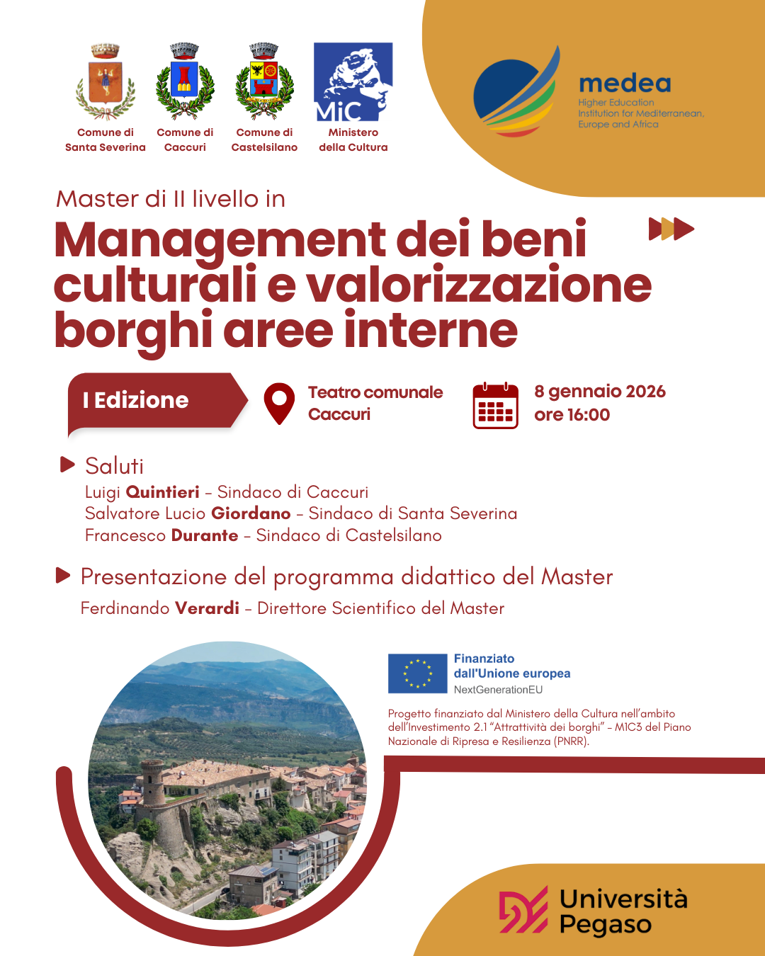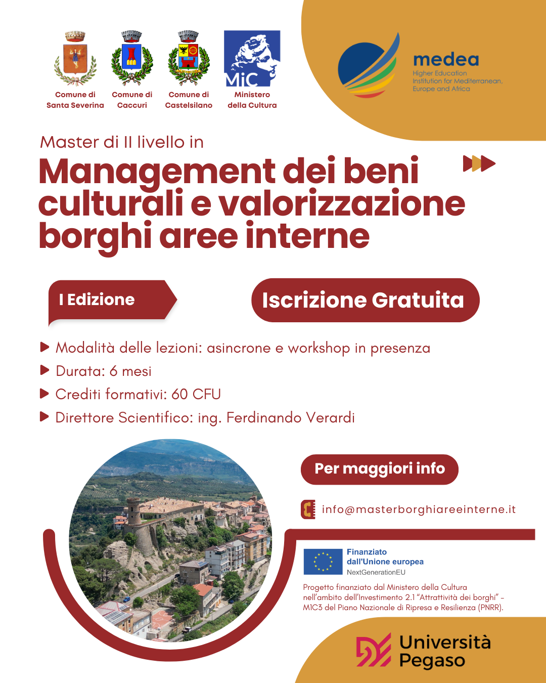 Il Comune di Castelsilano unitamente ai comuni di Caccuri e Santa Severina nell’ambito dell’intervento finanziato “Promozione dei luoghi, delle culture e delle esperienze nei borghi dell’Alto Marchesato Crotonese”, finanziato a valere sull’Investimento 2.1 “Attrattività dei borghi” del PNRR Attrattività dei borghi – Linea B”, promuove il Master di II livello in "Management dei beni culturali e valorizzazione borghi aree interne".